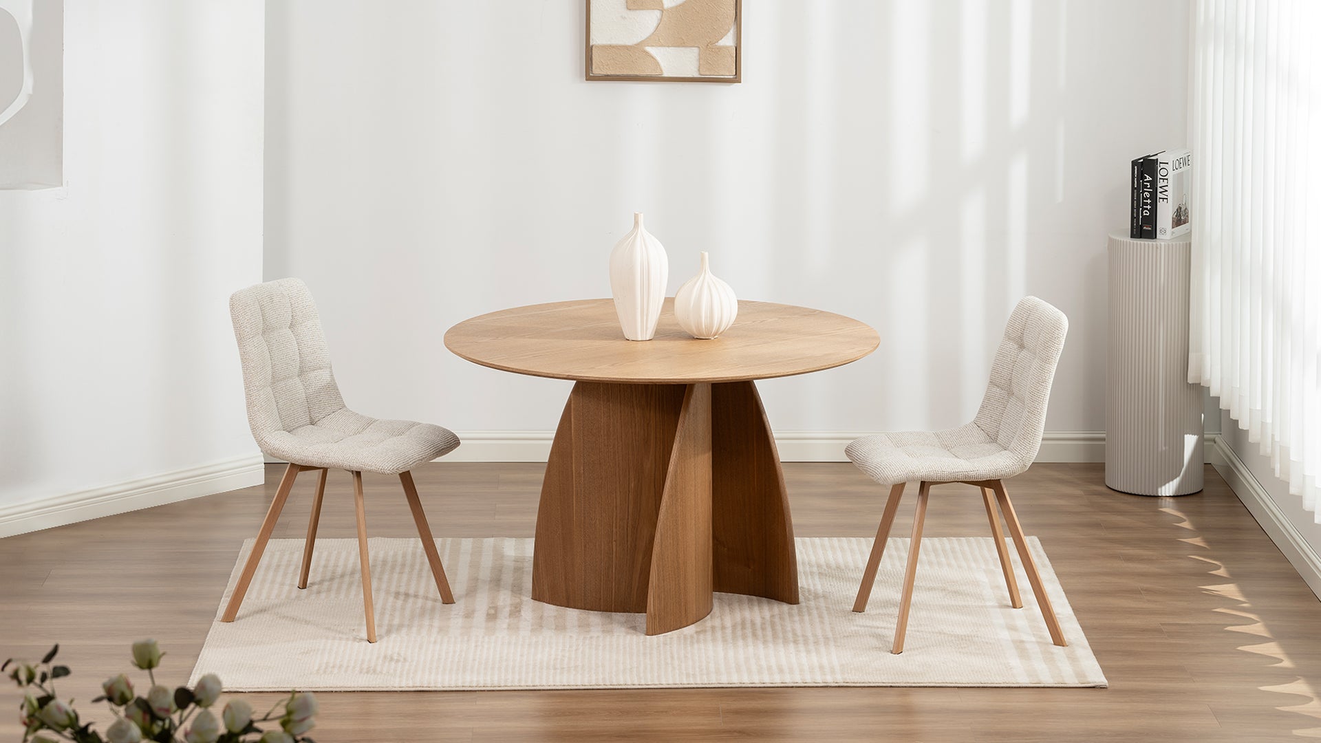 Fabricada em MDF durável com revestimento em madeira texturizada, o tampo é resistente a arranhões e derramamentos – basta limpar com um pano após o jantar ou acidentes com café. A base de pedestal, formada por painéis sólidos de MDF, garante estabilidade excepcional, eliminando problemas de pernas bambas ou cantos inconvenientes.