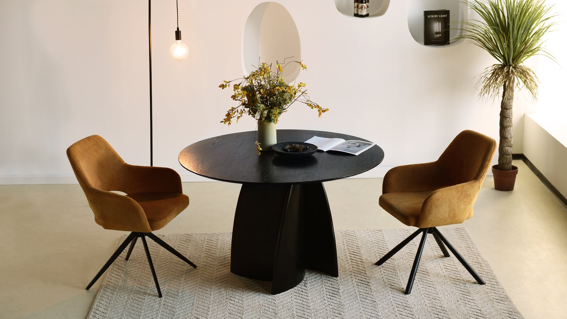 Destaque-se com a mesa de jantar redonda Gemma, finalizada em um elegante laminado preto que transforma instantaneamente qualquer sala de jantar ou espaço aberto. Com um generoso diâmetro de 120 cm, oferece amplo espaço para quatro pessoas, enquanto sua silhueta curvilínea se adapta perfeitamente tanto a apartamentos urbanos modernos quanto a cozinhas rústicas de inspiração escandinava.