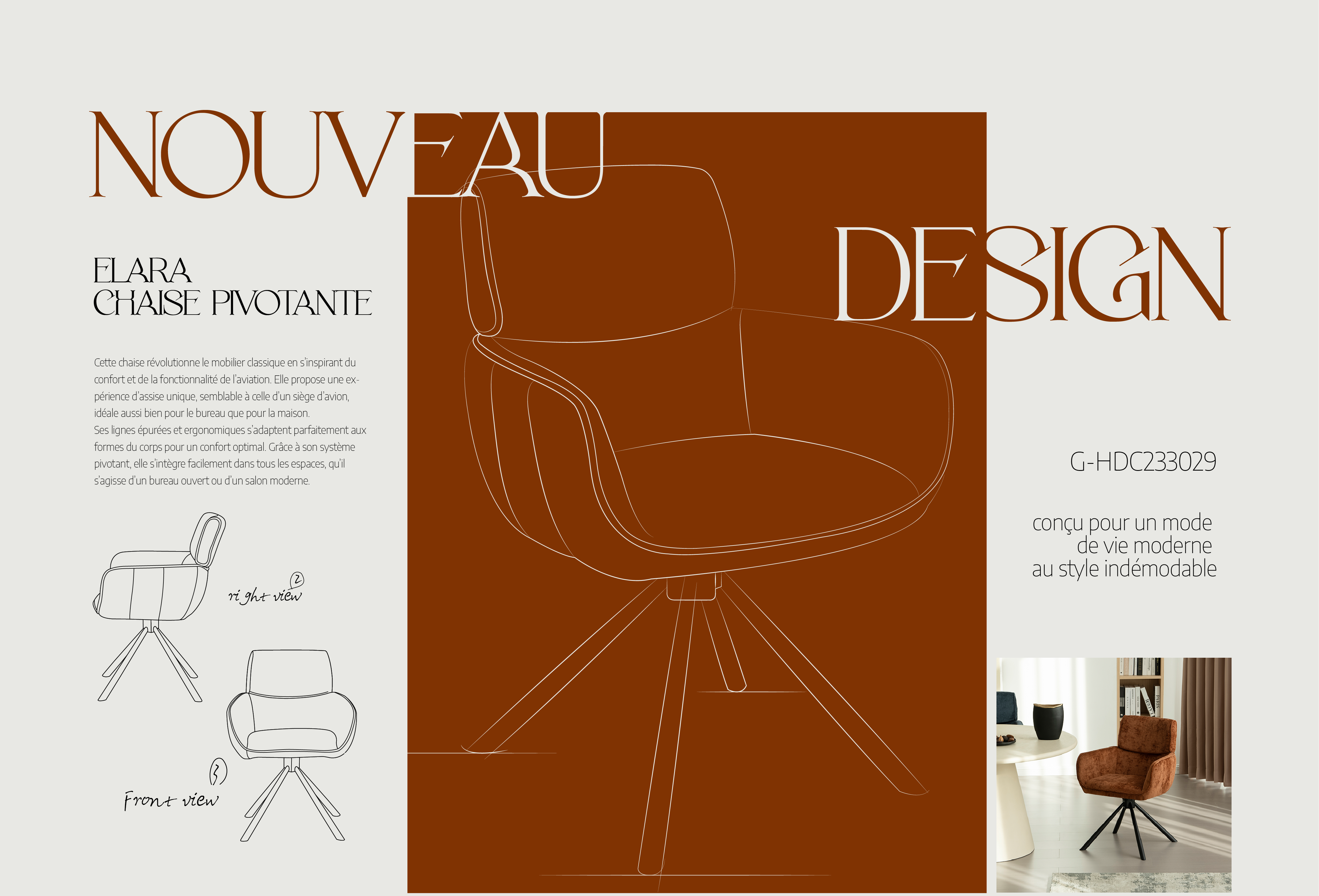 A rotação 360° da Elara permite alcançar o sal ou brindar aos bons momentos sem sair do lugar. O encosto suavemente curvado e o apoio de braços integrado envolvem você em conforto, enquanto as costuras verticais precisas adicionam um toque de design. Elas se encaixam perfeitamente em uma mesa com quatro cadeiras ou se destacam como uma dupla elegante em um cantinho de leitura.